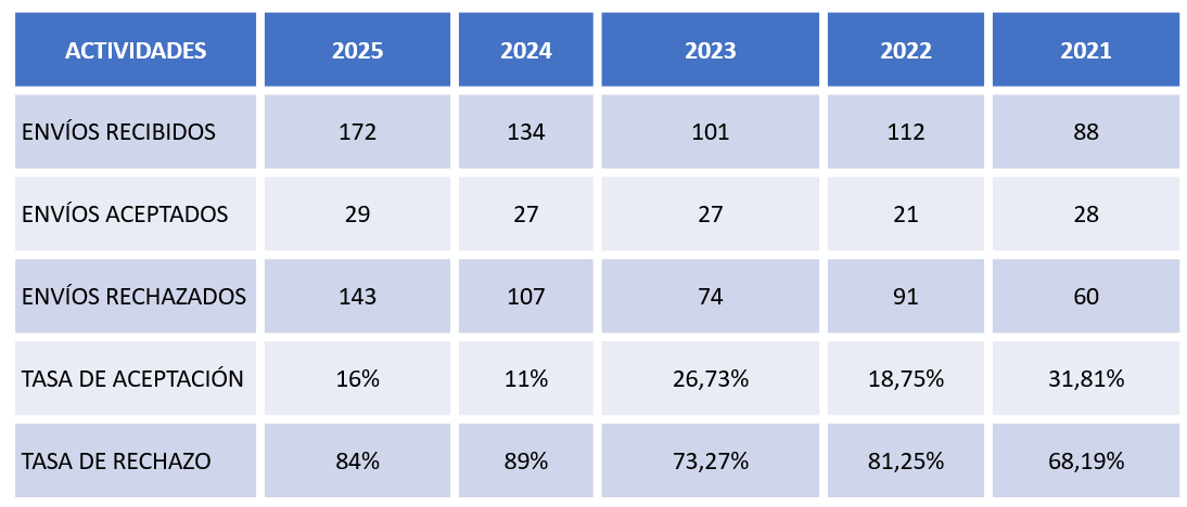 2021: 25%. 27 artículos aceptados de 94 presentados